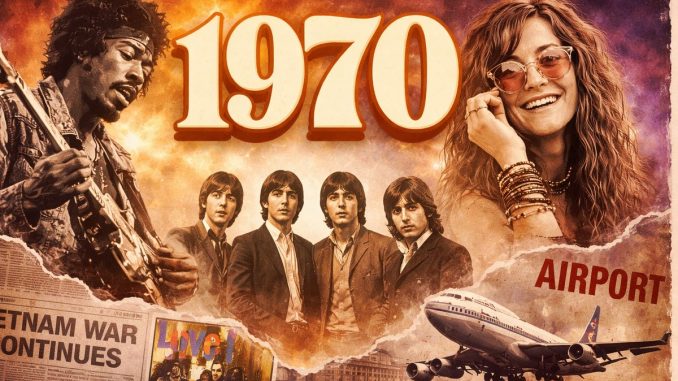 The Vietnam War continues, but the energy around it feels less like confrontation and more like exhaustion. At the same time, the deaths of Jimi Hendrix and Janis Joplin mark the loss of two defining voices of the previous decade, while the breakup of The Beatles removes the era’s most unifying presence altogether. Even popular film reflects this shift. Love Story centers on intimacy and loss, while Airport focuses on containment and survival within a controlled system.